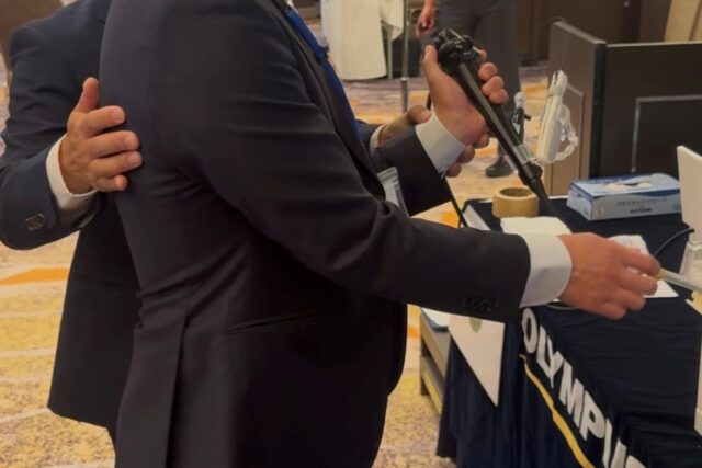 後期修練医、4年目の坂東太郎先生の結石学会の参加記をお届けします。 4月に全国デビューを果たし、今回は手術トレーニングにも参加して、一皮むけた感じでしょうか。 最近3年目の先生の学会発表の様子が多かったですが、先輩もステップアップして頑張っています。 心なしか3年目の先生より頼もしさが出ている!?(以下写真) 『このたび、2025年8月29日から30日にかけて東京都で開催された日本尿路結石症学会第35回学術集会に参加してきました。私は「尿路結石に伴う閉塞性腎盂腎炎における重症化リスクの検討」について発表の機会をいただきました。普段、我々は閉塞性腎盂腎炎に対して、ごく当然のようにドレナージ目的で尿管ステントを留置しておりますが、実はガイドライン上に明確な適応が記載されているわけではありません。そこで今回の検討では、どのような因子を持つ患者が重症化しやすいのかを検討し、臨床的に意義のある知見を示すことを目的としました。 準備の過程では、研究のアウトカム設定が大きな課題となり、臨床的に意味のある指標をどのように統計学的に裏付けるかに本当に苦労しました。統計解析に本格的に取り組むのは今回が初めてであり、Rの基本的な使い方から丁寧にご指導していただいた松本先生には心より感謝申し上げます。また、データ収集にご協力いただいた医局員の皆様、発表に向けて数多くのご助言をいただきました先生方のおかげで、内容を一層充実させることができました。誠にありがとうございました。 学会期間中には、事前予約制のハンズオンセミナーにも参加いたしました。普段何気なく行っている尿管鏡操作やバスケットカテーテルの使用について、限られた手術時間の中で効率よく進めるためのポイントをエキスパートの先生方から直接学ぶことができ、大変貴重な経験となりました。約3時間のセミナーでしたが、知らず知らずのうちに出来上がってしまっていた手技上の癖を修正でき、今後の手術に直結する学びを得られたと実感しています。これまで、ほとんどハンズオンセミナーに参加したことがなかったので、今後は機会があれば是非また参加したいと思います。 発表準備から当日の質疑応答まで、苦労も多く緊張も伴いましたが、多くの学びや気づきを得られた有意義な機会となりました。今回の経験を糧に、日々の臨床現場に還元していけるよう努めてまいります。』 松本先生と一枚 内視鏡手術のハンズオンセミナーでのトレーニングの様子