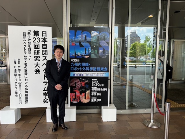 泌尿器科領域においては、 今まで腹腔鏡で行っていたほとんどの手術が ロボット支援手術で通常診療(保険診療)として施行されており、 大変身近なものです。すべての外科系領域の中で泌尿器科がもっともロボット手術を行っているとはあまり知られていないかもしれませんね。 今回はロボット手術に関する学会報告。 杉田先生は昨年7年目で専門医試験を合格後、ロボット手術の術者資格を取得していただき、すでに術者として活動し、医局のサポートにおいて研鑽を積んでいます。 『第35回九州内視鏡・ロボット外科手術研究会参加報告 医師8年目の杉田です。このたび、2025年8月30日に開催されました第35回九州内視鏡・ロボット外科手術研究会に参加する機会を賜りました。本研究会は、泌尿器科のみならず消化器外科、呼吸器外科、産婦人科といった複数の診療科が一堂に会し、ロボット支援手術や内視鏡外科手術に関する最新の知見を共有する貴重な場でございます。診療科横断的に多彩な演題が集まるため、自身の専門領域にとどまらず幅広い視点から学ぶことができました。 特に印象的であったのは、外科領域からのご報告で、閉鎖孔ヘルニアに対し卵巣を用いて修復を行った症例に関する発表でした。自科では経験のない術式であり、疾患や解剖の特性を活かした巧みな工夫に深く感銘を受けました。こうした発想は他科の研究会に参加してこそ得られる学びであり、大変興味深い発表でした。 私は今回、「ロボット支援下根治的膀胱全摘除術後骨盤内リンパ漏について」発表させていただきました。質疑応答では、消化器外科や産婦人科の先生方からもご意見を頂戴し、リンパ節郭清時のエネルギーデバイスの使用方法やクリッピングの是非に関して多様な視点を知ることができました。各科に共通する課題であると同時に、組織特性や術式の違いにより工夫も異なることを実感し、大変有意義なディスカッションとなりました。 また、本発表にあたりましては、事前に医局の先生方に何度も予演の機会を頂戴し、貴重なご助言・ご指導を賜りましたことに厚く御礼申し上げます。ご指摘いただいた点を踏まえ、専門外の先生方にも理解いただけるようスライド構成や表現方法を工夫することができ、発表を無事に終えることができました。 本研究会を通じ、診療科の垣根を越えた交流の重要性と、他分野から学ぶ姿勢の大切さを改めて認識いたしました。今後も日常診療に還元するとともに、研究活動にも反映させていきたいと考えております。 末筆ながら、引き続きご指導ご鞭撻のほど何卒よろしくお願い申し上げます。』