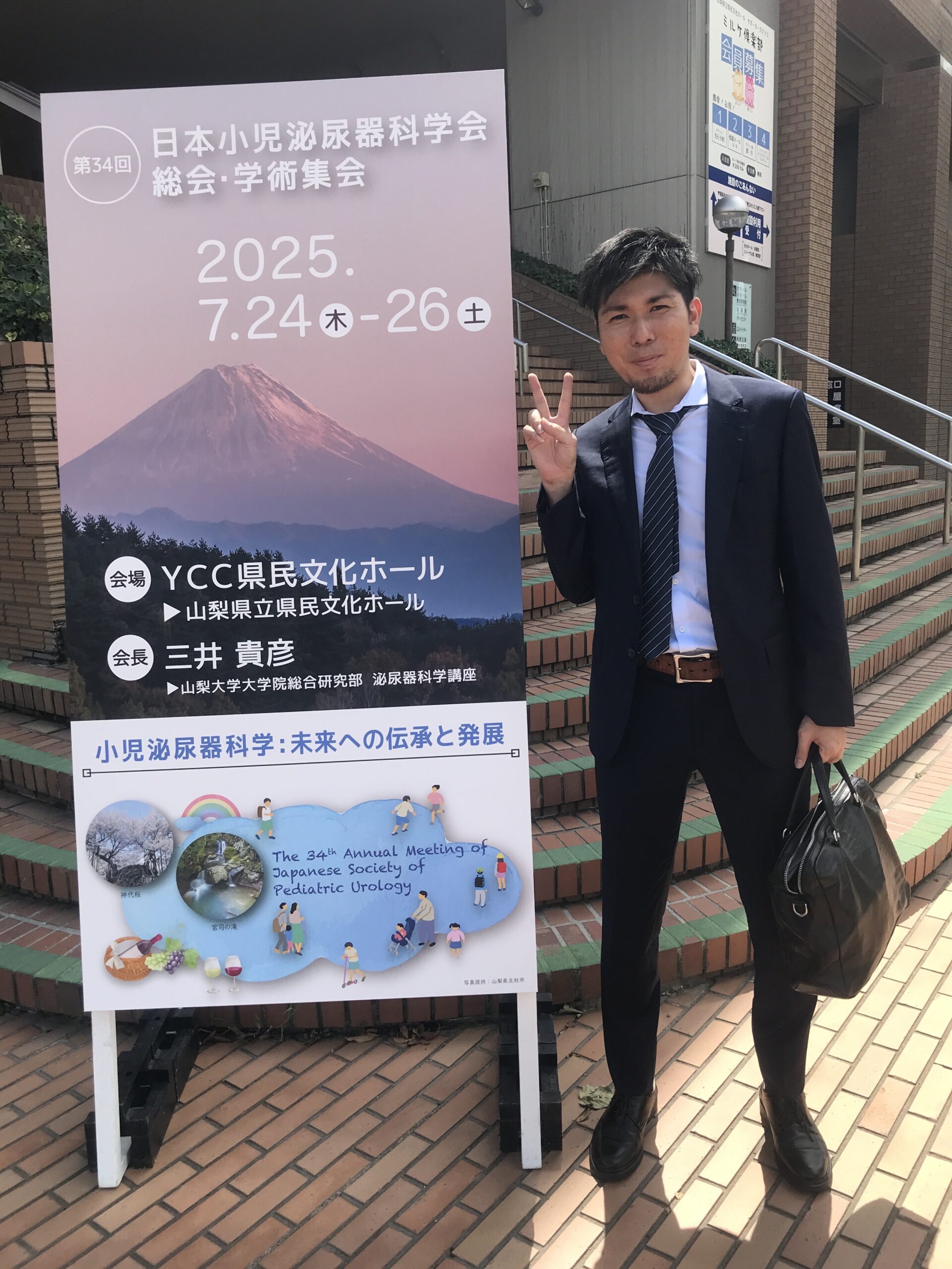 先日の高齢化社会を反映した診療から一転、 本日は小児泌尿器の学会報告。 『 第34回日本小児泌尿器科学会総会参加記 渡邉舟貴 2025年7月24日から計3日間開催された山梨県甲府市で開催された第34回日本小児泌尿器科学会総会に参加し発表させていただきました。演題名は「膀胱尿管逆流症に対するカラードプラ法超音波検査による尿管口jet角の検討」でした。 膀胱尿管逆流症の確定診断は排尿時膀胱尿道造影が一般的ですが、放射線被爆や必要時には鎮静を要するといった検査の侵襲性の観点から、発熱性尿路感染症を発症した患児全例に対して排尿時膀胱尿道造影を施行することに批判的な見解があります。カラードプラ法超音波検査による尿管口jet角を測定することで、不要な排尿時膀胱尿道造影を減らすことができればと考えています。 学会発表は3日目でしたので、自分の発表はまだかまだかと1日目から気もそぞろでした。発表は入念な予行で緊張しながらも問題なく終了しましたが、質疑応答で上記演題に関して多数の文献報告されているパイオニアといっても過言ではない先生から、質疑というより今後さらなる検証をすすめていく上でのアドバイスをいただきました。 自分は小児泌尿器科という分野に2-3年前から興味を持つようになり、この総会での発表にずっと憧れていました。その発表がついに実現でき、学会会場で沢山の先生方に声をかけていただき、とても幸せな時間を過ごすことができました。今後も小児泌尿器科の分野で学術発表を頑張っていこうとモチベーションが高まりました。』 渡邉先生は外来医長という大学診療のゲートキーパーとしての役割に加えて、小児泌尿器科を熱心に勉強されています。